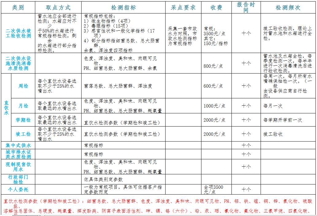 檢測(cè)項(xiàng)目:1色度、2渾濁度、3游離氯、4一氯胺、5臭和味*、6肉眼可見物*、7pH、8總硬度、9鋁、10鐵、11錳、12銅、13鋅、14鉛、15鎘、16硒、17揮發(fā)酚類、18陰離子合成洗滌劑、19硫酸鹽、20氯化物、21溶解性總固體、22耗氧量、23砷、24鉻(六價(jià))、25氟化物、26汞、27硝酸鹽氮、28氰化物、29菌落總數(shù)、30總大腸菌群、31耐熱大腸菌群、32大腸埃希氏菌、33四氯化碳、34三氯甲烷、□(二氧化氯、亞氯酸鹽、氯酸鹽)、□(臭氧、甲醛、溴酸鹽)